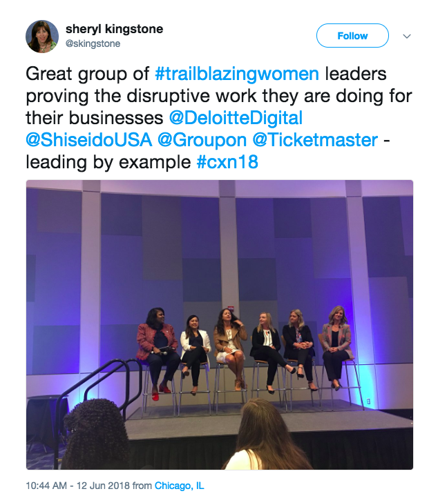 Moderated by Molly Ford, Salesforce’s Senior Director of Global Equality Programs, the conversation touched on the topics of sponsorship vs. mentorship, negotiating salaries, advice for younger selves, and other important topics for women professionals. Catherine Wood of Ticketmaster, Andrea Armstrong of Alight Solutions, Erica Geil of Groupon, Angelica Munson of Shiseido, and Tracie Kambies of Deloitte delighted the audience with anecdotes and tangible advice.