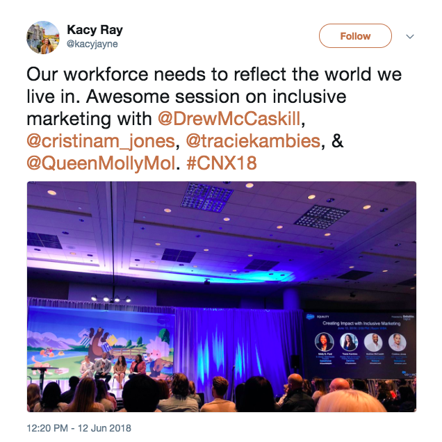 Customer loyalty aligned with a company’s values was the topic of the “Creating Impact with Inclusive Marketing” Super Session, hosted by Salesforce’s Senior Director of Global Equality Programs, Molly Ford. Featuring Tracie Kambies of Deloitte, Andrew McCaskill of Nielsen, and Cristina Jones of Salesforce.