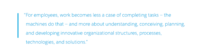 For employees, work becomes less a case of completing tasks — the machines do that — and more about understanding, conceiving, planning, and developing innovative organizational structures, processes, technologies, and solutions.