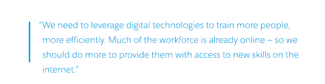 For businesses in many parts of the world, it often makes economic sense to retrain workers rather than replace them. Retraining can be carried out more efficiently if we take a systematic approach to it:providing people with broader options and deploying diverse models, including apprenticeships, vocational training, and lifelong learning. We need to leverage digital technologies to train more people, more efficiently. Much of the workforce is already online,so we should do more to provide them with access to new skills on the internet.
