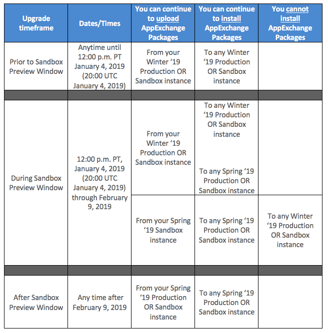 If you decide to stay on the current Winter ‘19 release, your Sandbox will not be upgraded to Spring ‘19 until February 9, 2019.