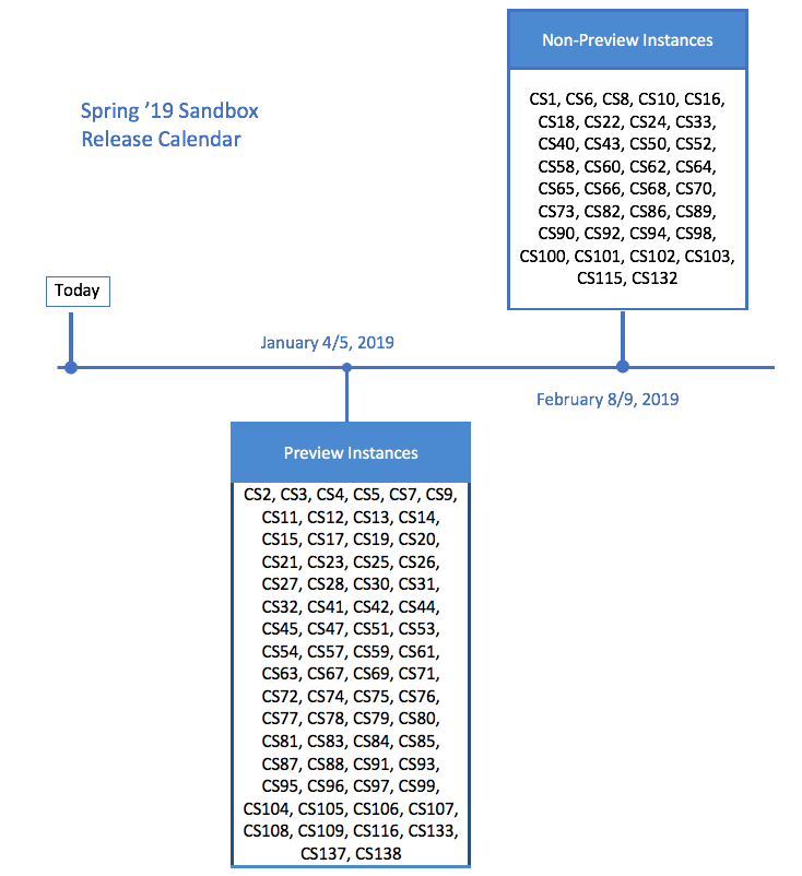 Sandbox Instances are split up in two groups – Preview and Non-Preview. Preview Instances are instances which get upgraded to the newer version of Salesforce before Production Instances (e.g. NA2, EU1, AP0) and Non-Preview Instances are upgraded towards the end of a Major Release along with the majority of Production Instances. For the Spring ‘19 Release, the Preview Instances will be upgraded to Spring ‘19 on January 4 and January 5, 2019 and Non-Preview Instances will be upgraded to Spring ‘19 on February 8 and February 9, 2019.