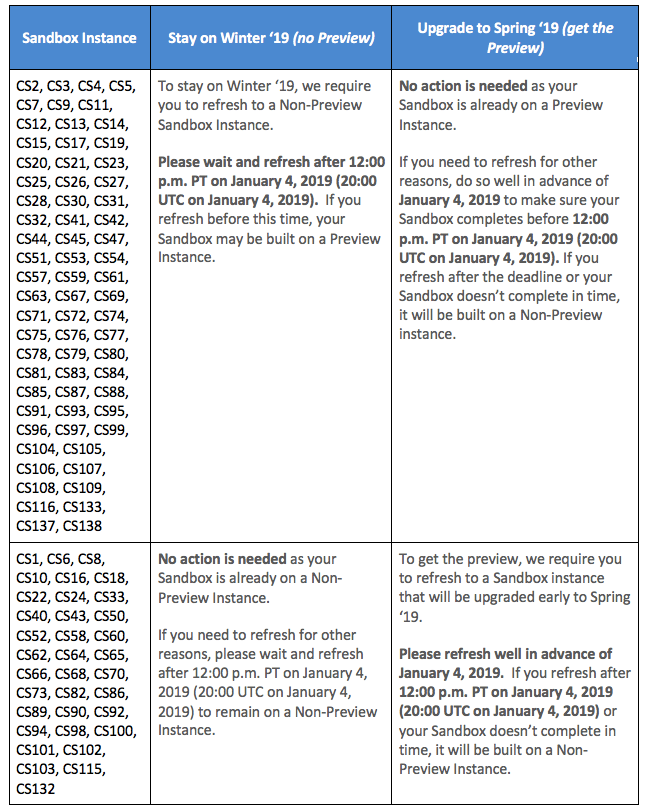 Please read carefully and follow the instructions in the next section for specific information on how to handle each of your Sandboxes. In most cases, you will not need to do anything because your Sandbox is already on a preview instance. But you may need to take action before January 4, 2019 in order for your Sandbox to take part in the Spring ‘19 Preview.