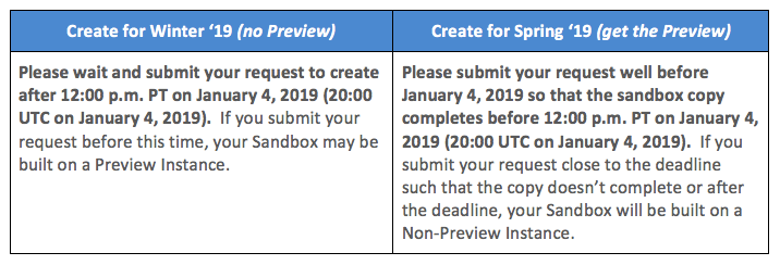On January 4, 2019, all incomplete sandbox requests will be reset on a Non-Preview Instance and pending and new sandbox requests will be routed to Non-Preview Instances until your Production Instance is upgraded to Spring ‘19.