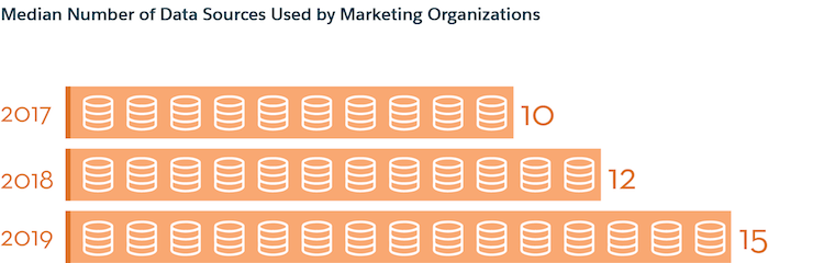 Marketers are using more data sources than ever. The average number of data sources has grown by 20% since 2017, and the median number of data sources marketers use is forecast to jump from 12 in 2018 to 15 in 2019.