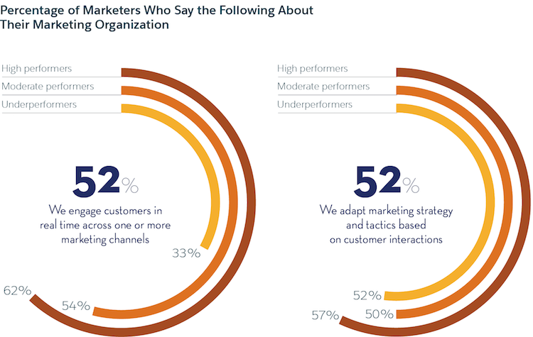 52% of marketers engage customers in real time across one or more channels. High performers are 1.9x more likely than underperformers to engage customers this way.
