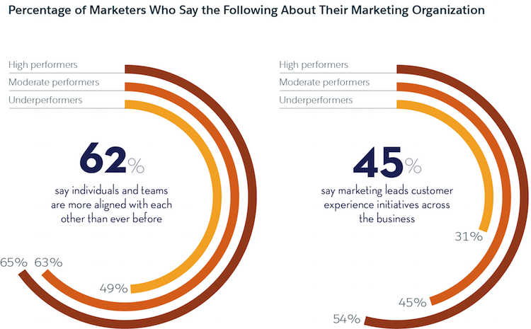 62% of marketing leaders say individuals and teams in their departments are more aligned with each other than ever. They’re driving cohesive customer journeys across the whole of marketing, rather than just their own channel or function — the more aligned they become, the better they perform.