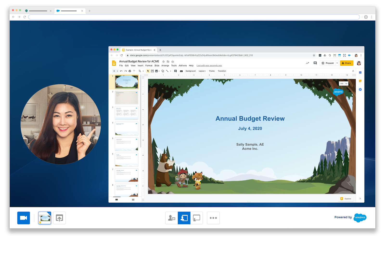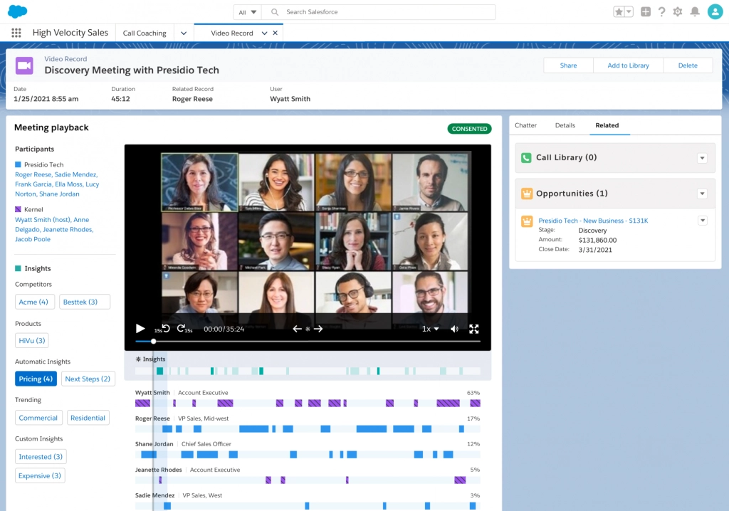Salesforce Meetings: agora está disponível de maneira geral e torna as conversas virtuais mais envolventes. Antes de uma reunião, os vendedores têm uma visão 360º de todos os participantes em uma única tela - incluindo o histórico da conta, casos de serviço abertos e biografias. Assim que a reunião começa, a apresentação e o apresentador aparecem juntos para uma conexão humana mais envolvente. Após a ligação, os itens de ação automatizados solicitam ao vendedor que agende uma reunião de acompanhamento ou crie um contato para um novo tomador de decisões.
