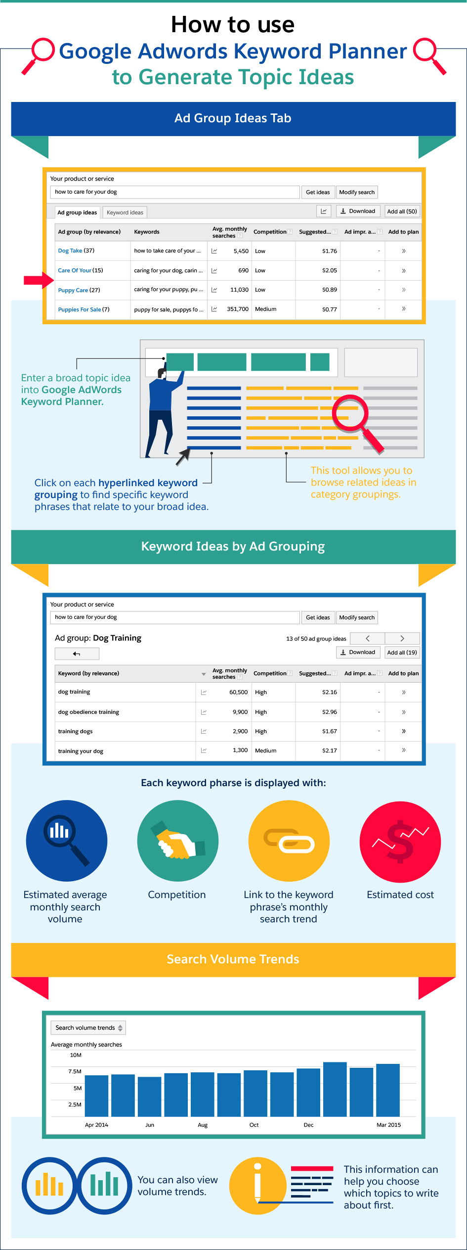 For example, if you sell products for dog owners, your broad idea can be, “How to Care for a Dog.” There's no way to cover that whole topic in one blog post, and if you tried, each point would be so short it may not be very useful. This kind of broad idea is perfect because it must be split into smaller topics to be covered thoroughly. Once you’ve determined your broad idea, define those smaller topics.