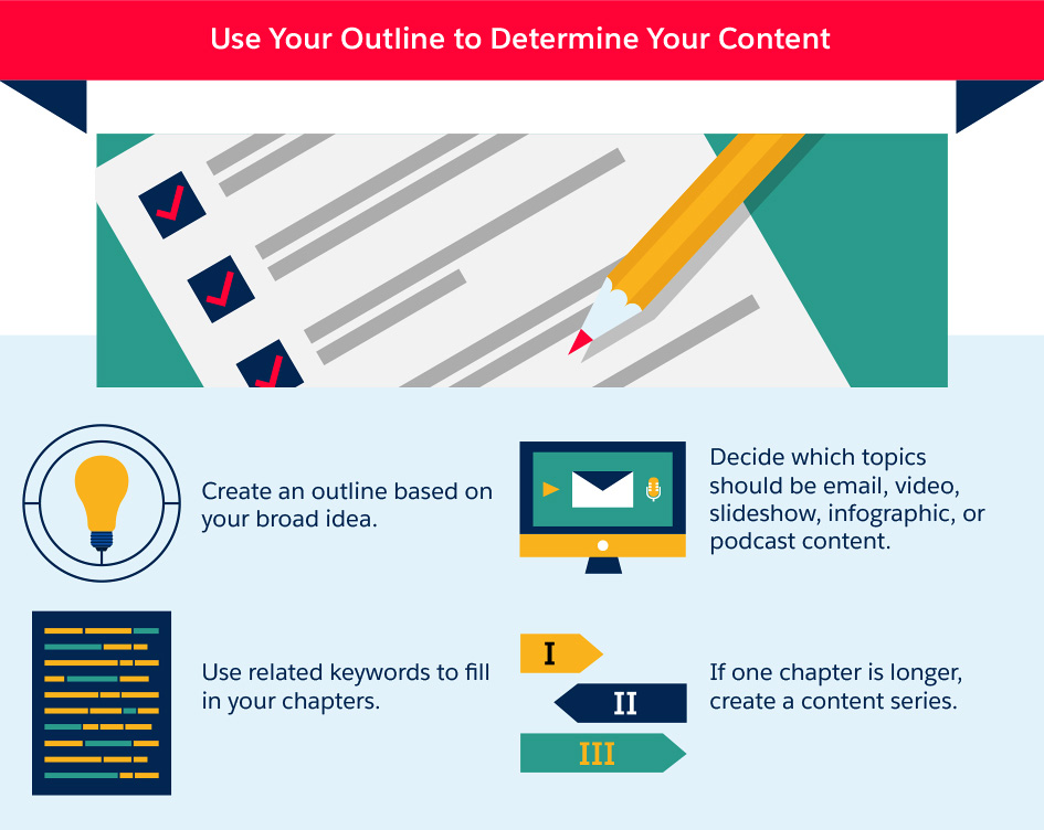 Once you organize the specific topic ideas you generated from your broad idea, the next step is to create your content. Remember: You do not have to limit yourself to content for your blog. As you look through your outline, consider which topics would work well as other forms of content, especially on social media channels. Consider repurposing your content into an email, video, slideshow, infographic, or podcast series.