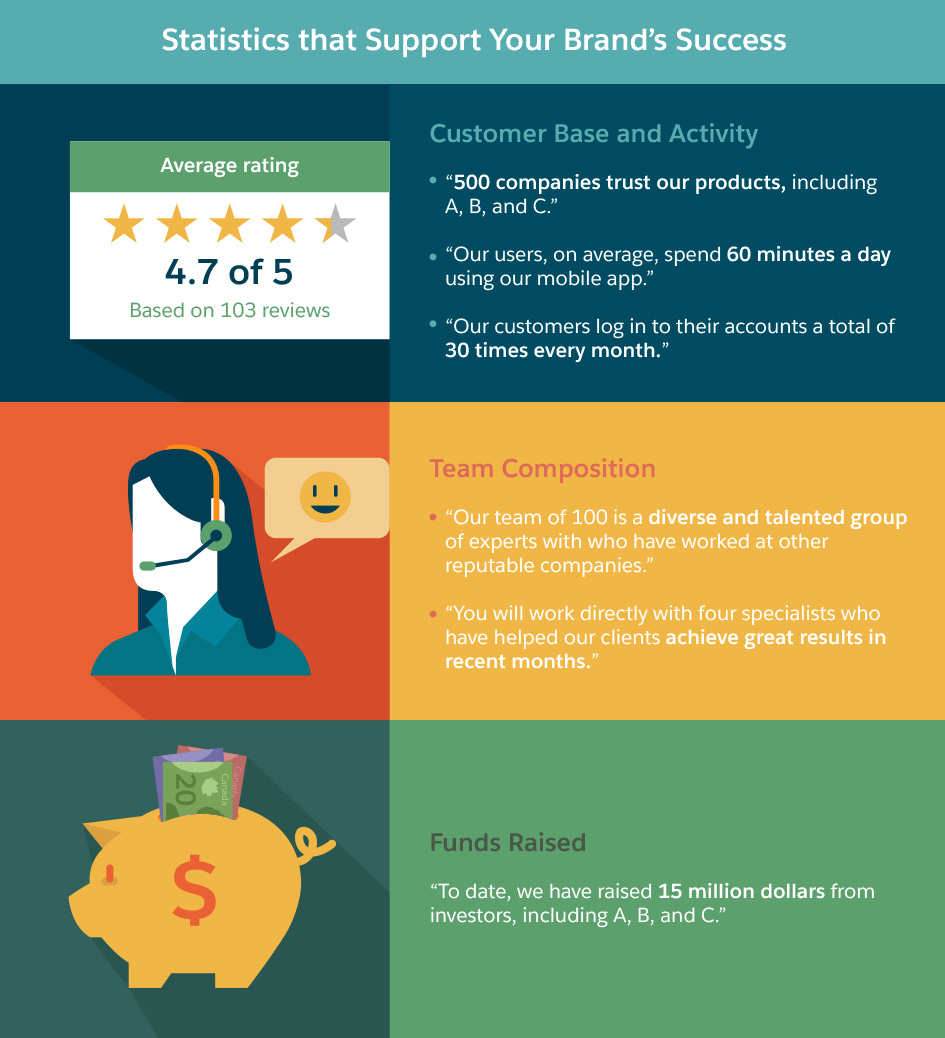 For startups, the amount of money a company has raised offers proof of concept and powerful third-party validation. To strengthen your sales pitch, share how much investors have given to own a piece of your company and support business growth. Be sure to include a short list of recognizable investors, too.