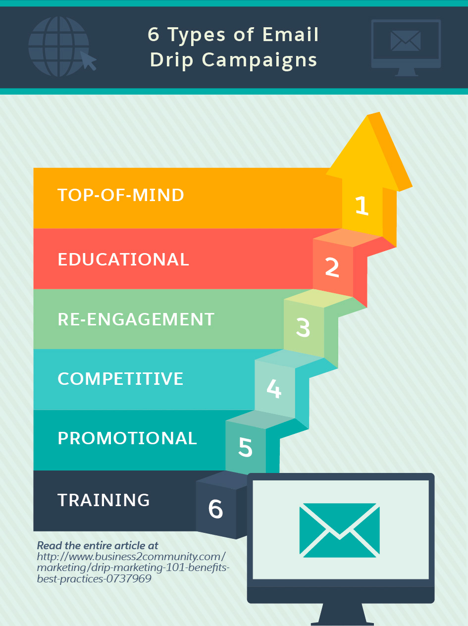 According to marketing strategist Janelle Johnson, there are six types of drip campaigns: