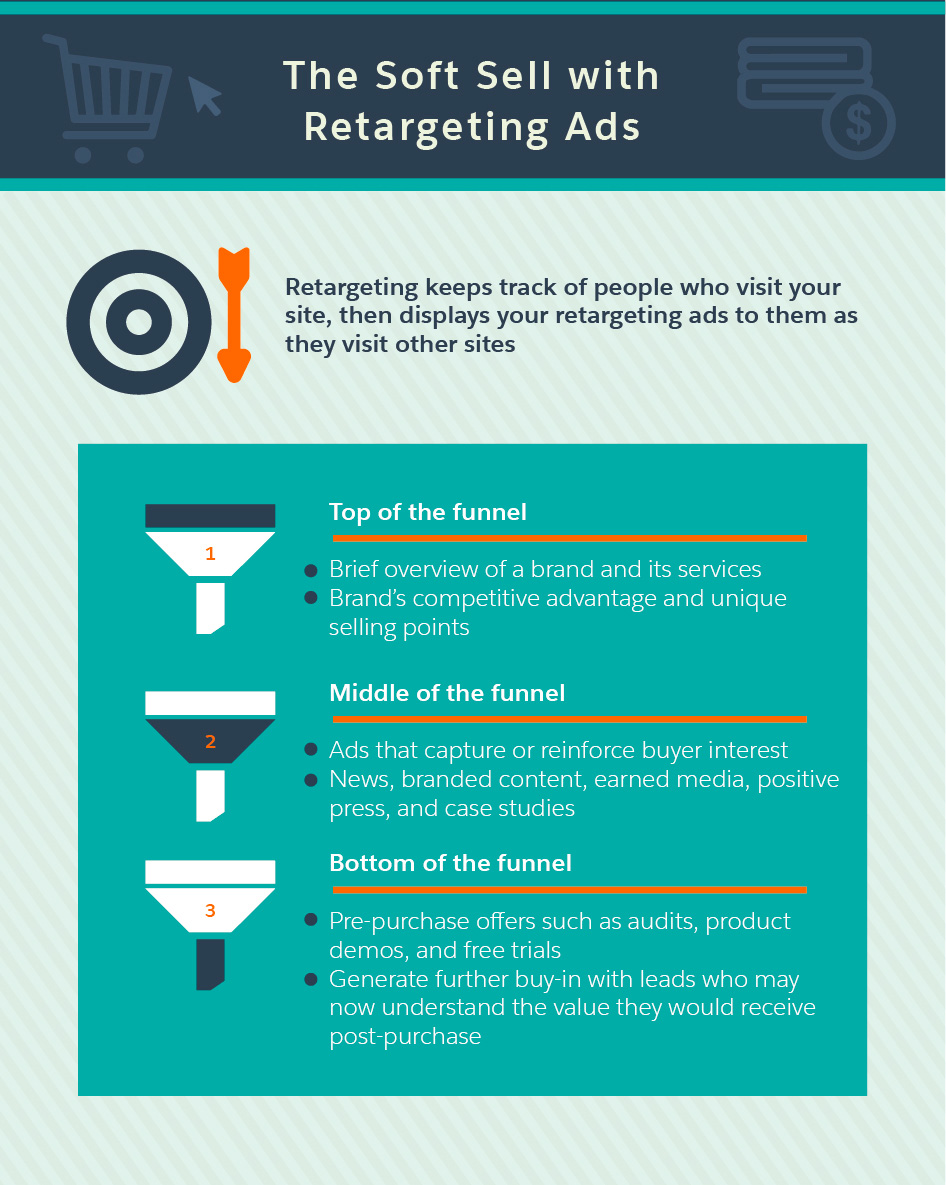 The most successful soft-sellers employ targeted ads to deliver content and information prospects need to progress through each stage of the sales cycle. With retargeting, brands guarantee that their ads will be viewed by audiences that recently interacted with their website.