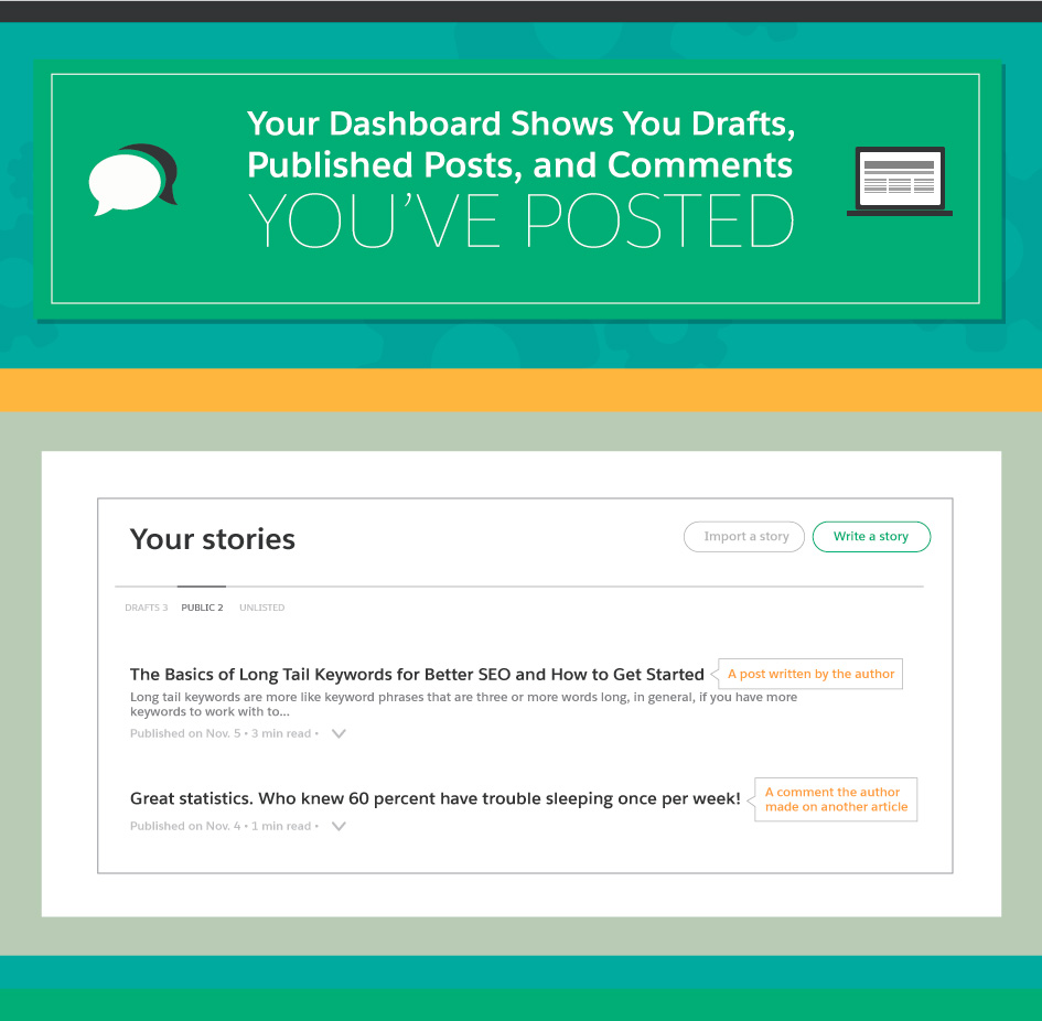 Click your photo icon on the top right corner to get to your dashboard, where you can see your drafts, published posts, and any comments you’ve published.