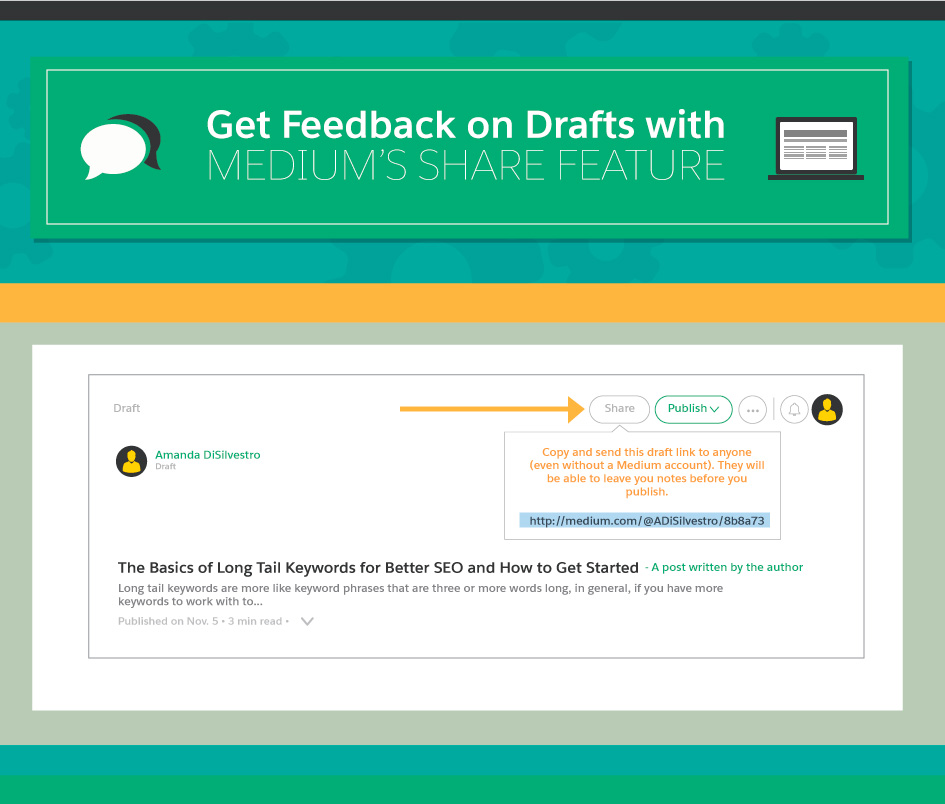 This feature is more for writers. Before you publish, it allows you to leave comments on your own articles as footnotes and ask others to look at your post and make comments. You can also send the draft directly to others to get their feedback. Writers can put this link on their social media accounts to maximize visibility.