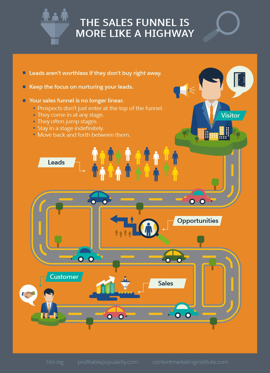 Indeed, the modern day sales funnel is no longer linear. To adapt to changing times, salespeople should avoid abandoning relationships with leads who are not yet ready to make a purchase.