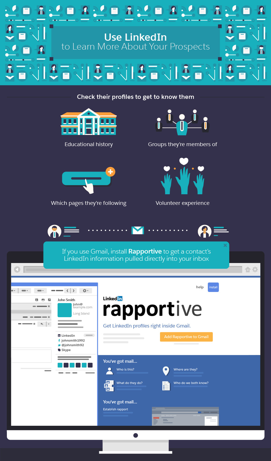 Add tools directly to your inbox to make connecting with prospects and clients easy. SalesforceIQ works with your Gmail or Exchange account to tie your inbox to your CRM. And Rapportive is a free tool you can use in Gmail to get insights on your prospects from inside the comfort of your inbox. It takes your prospect's email address and searches for them on LinkedIn. When it finds the prospect, Rapportive pulls their pertinent LinkedIn information into your Gmail inbox when you open their message.