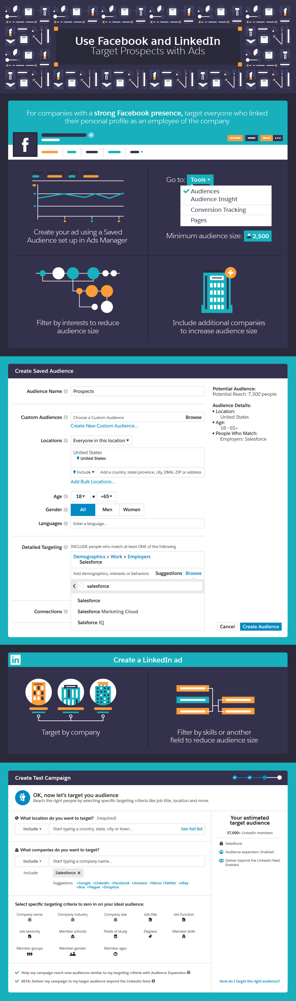 If you feel your audience size on either Facebook or LinkedIn is too large, you can limit the audience by adding skills or interests. For example, if you want to get everyone in the marketing department talking about your product, add marketing as an interest on Facebook and a skill on LinkedIn.