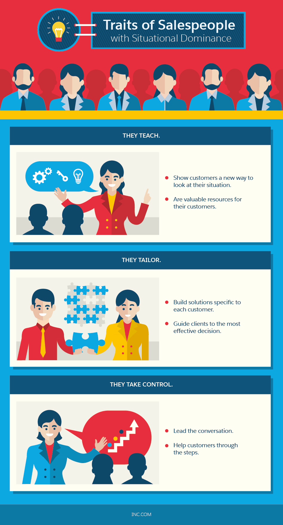 Steve W. Martin calls this same trait “situational dominance,” which he found in abundance among the top salespeople he tested. Situational dominance is not about grinding a customer down with a hard sell; that’s what people with low levels of situational dominance do. “A relaxed-dominant salesperson speaks freely and guides the conversation as he confidently shares his knowledge and opinions with the customer,” Martin writes.