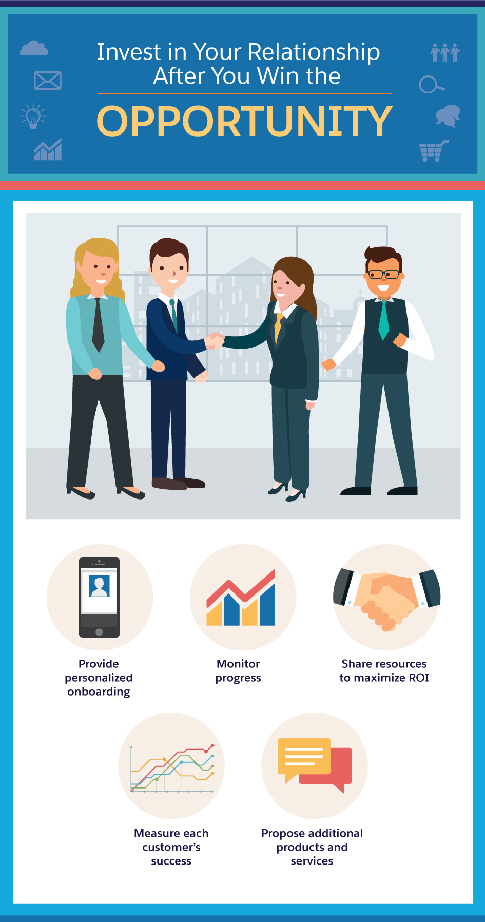 Finally, the sale is closed and sales reps can revisit this opportunity at the end of each contract to see there are ways to renew or update the engagement. To ensure a long and fruitful relationship, invest in thorough onboarding, monitor their progress throughout the engagement, provide resources to maximize ROI, measure their success, and propose new ways they may reinvest their earnings with your products or services.