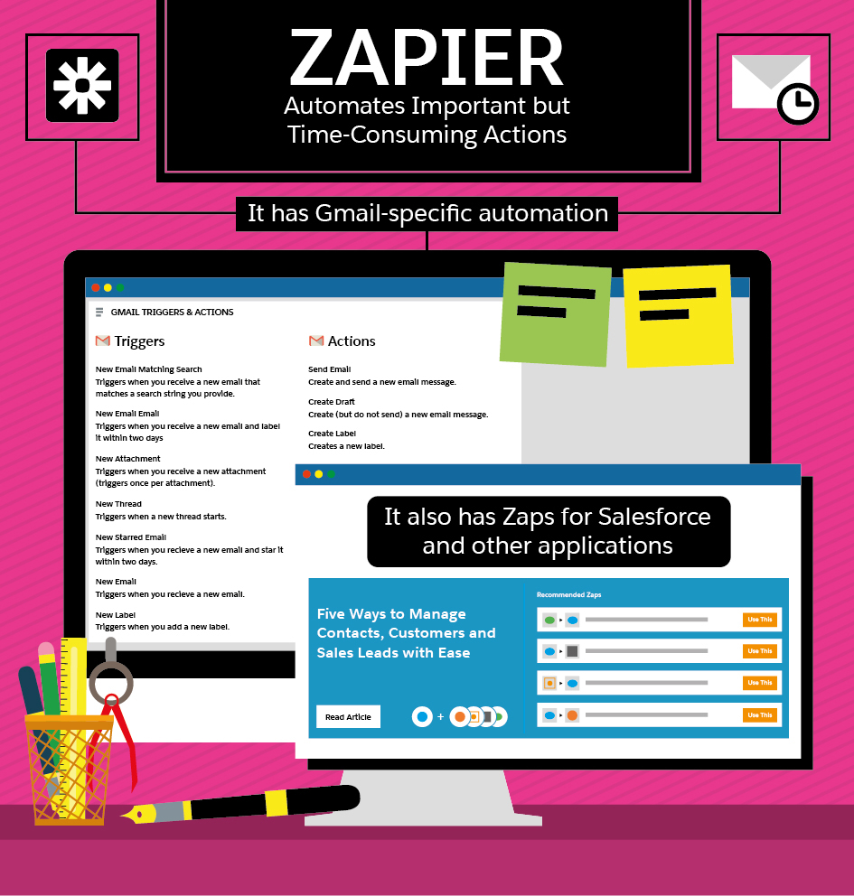 These two services allow you to automate tasks between your email and hundreds of other applications. The difference is IFTTT is a free service more for personal use, and Zapier is premium service geared toward business use.