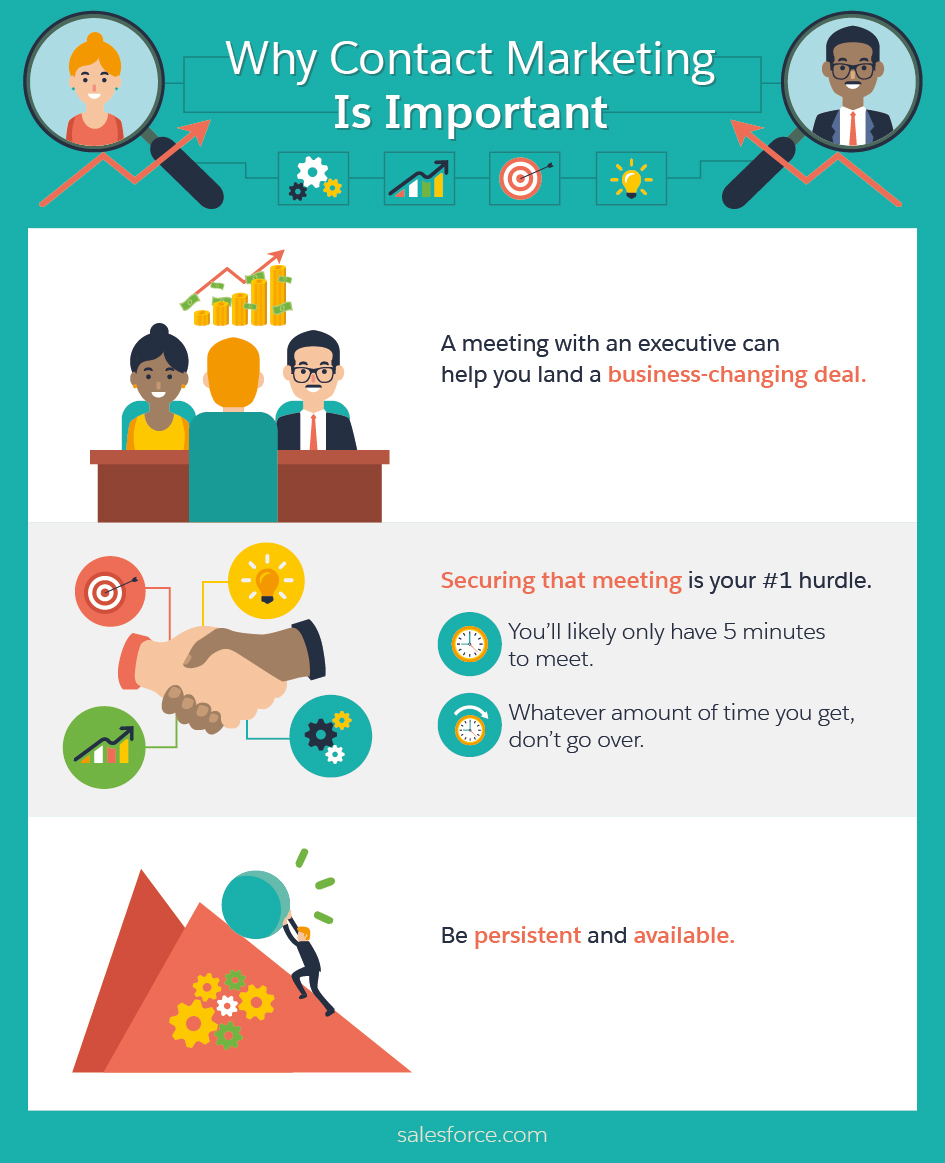 So how do you reach these high-level executives when they already have so many demands on their time? One surprisingly effective strategy is contact marketing, and it can be the key to getting the time you need with the right people at the right moment. With the principles of contact marketing, you can create optimal situations that allow you to explain why your business is poised to help this executive.