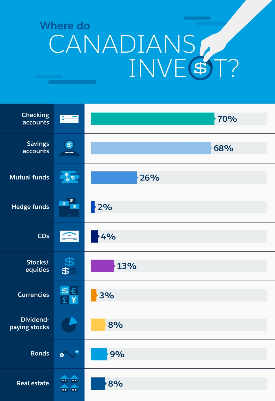 Overwhelmingly, people put at least some of their money in savings accounts: 68 per cent of people surveyed in Canada invest in savings accounts, compared to 71 per cent overall in the survey. In Canada, 70 per cent of people also invest in checking accounts, 13 per cent in stocks and equities, and 26 per cent in mutual funds. Less than 10 per cent each invest in hedge funds, certificates of deposit (CDs), currencies, dividend-paying stocks, bonds, and real estate.