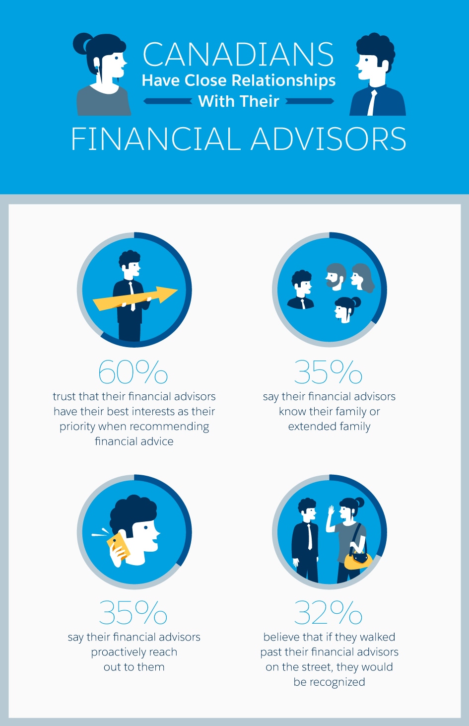 The good news is more Canadians feel their financial advisors make their investors’ interests a top priority—60 per cent compared to a total average of 47 per cent. Thirty-five per cent of Canadians say their advisors proactively reach out to them and 32 per cent say their advisors would know them if they met on the street. Internationally, those numbers are lower at 30 and 31 per cent, respectively. Forty-nine per cent of Canadian investors say their advisors would call them immediately if the stock market dropped 5 per cent or more in a day, while 64 per cent say their advisors would contact them if interest rates rose. Of all investors surveyed, 60 per cent want their advisors to be more proactive in recommending changes.
