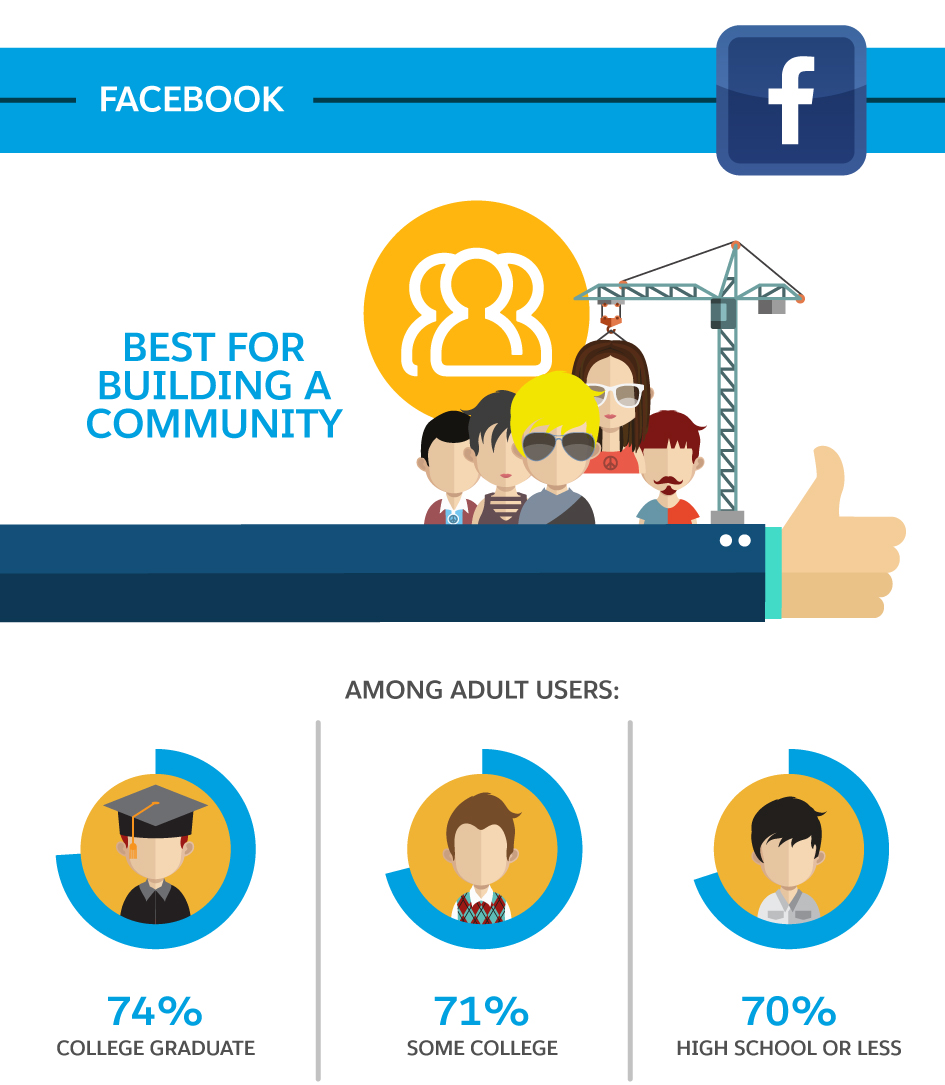 If your goal is to build community among your consumer base, then Facebook is the place to be. It’s especially good for facilitating conversations between brands and their users. Because it’s the most popular social site with the most active user base, Facebook is also a valuable platform if you’re trying to reach a broad audience. User data reveals that demographics span the full range of ages, gender, education, income level, and location.