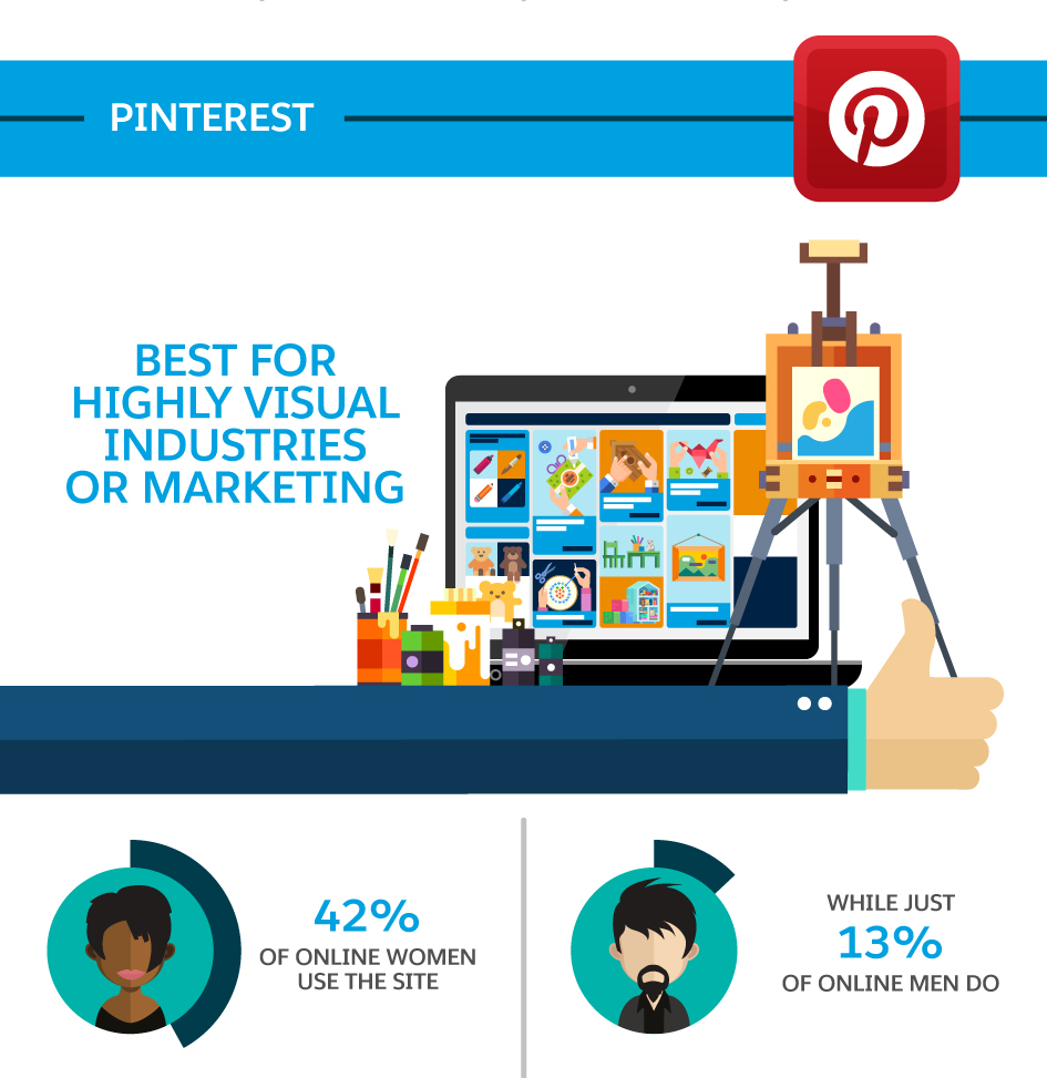 Like Instagram, Pinterest is best for brands with a visual component. Just slightly more adults use Pinterest than Instagram, and Pinterest skews heavily toward women: Approximately 44 per cent of online women use Pinterest, compared to only 16 per cent of men. The site also trends young, with 37 per cent of people under the age of 50 using the site. If your target demographic falls into these categories, then Pinterest can be a goldmine for engaging users.