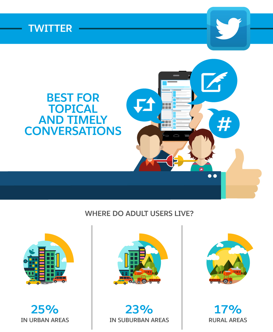 Twitter is all about trending topics and topical conversations. It’s a great option for reaching urban and/or suburban consumers: 25 per cent of Twitter’s user base resides in urban areas, while 23 per cent are in suburban areas. If you’re attempting to cultivate a hip, active, and vocal brand, then Twitter is an exceptional platform. Like Facebook, it’s great for facilitating conversation between consumers and brands.