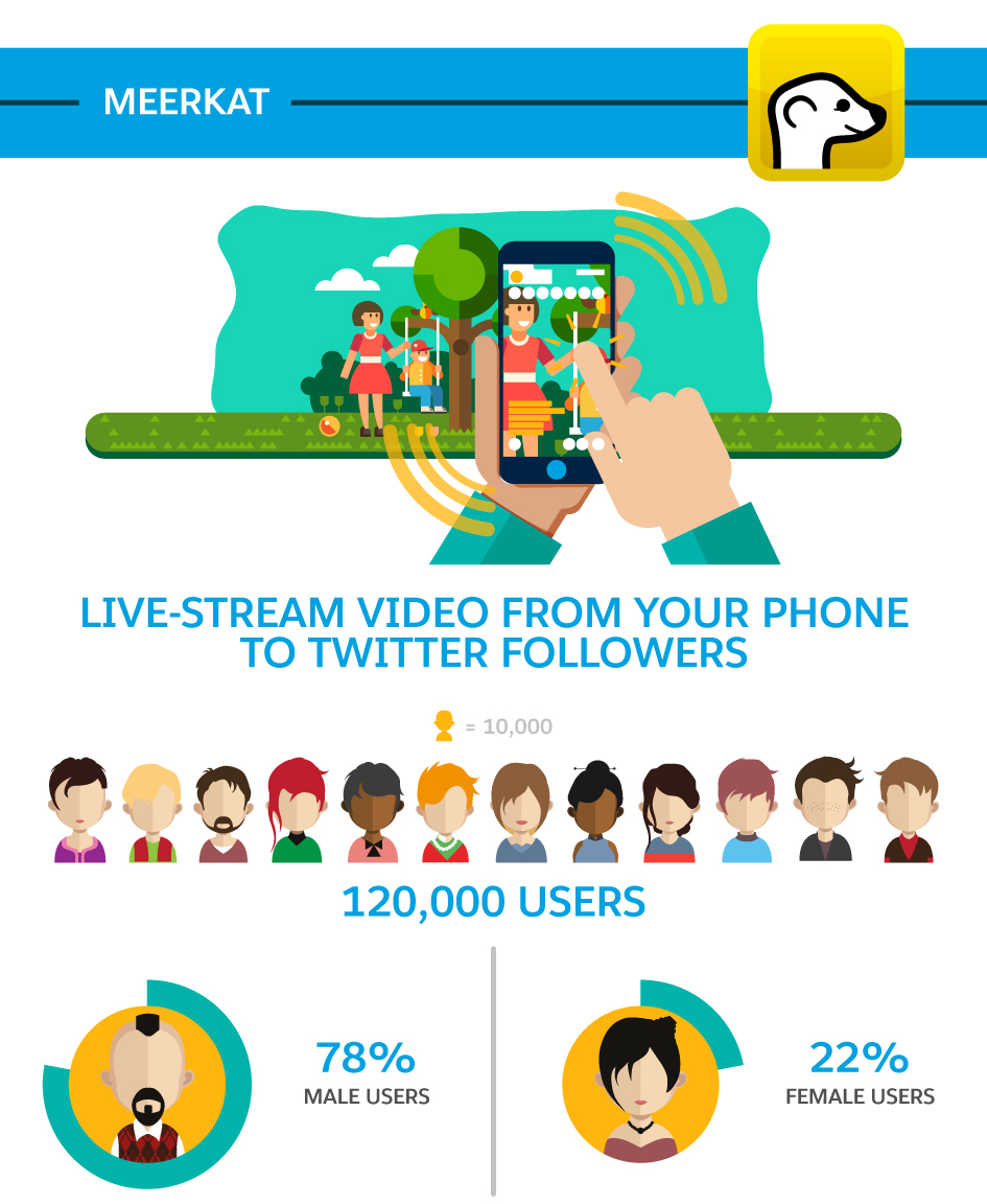 While less well known, Meerkat commands an audience of 120,000 users and growing. The platform allows users to live-stream video from their phones directly to their Twitter followers, so it’s best for visual content. The platform is unique in that it skews heavily toward males: 78 per cent of users are male.