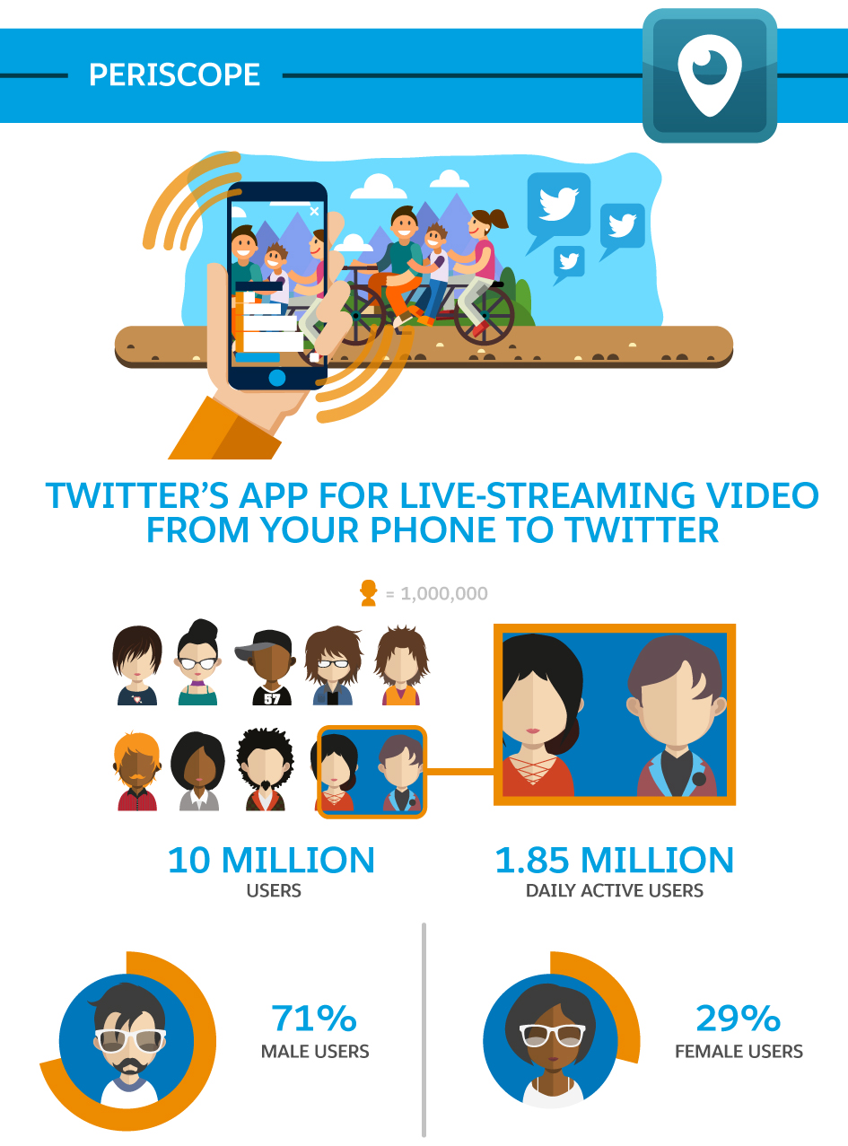 Periscope is a direct competitor to Meerkat: It allows users to live-stream video from their phones to Twitter. The app is owned by Twitter, so integration is seamless. Periscope also has a significantly larger user base, with 10 million users (1.85 million of whom use the app daily). Similar to Meerkat, the app skews toward males: 71 per cent of users are men.