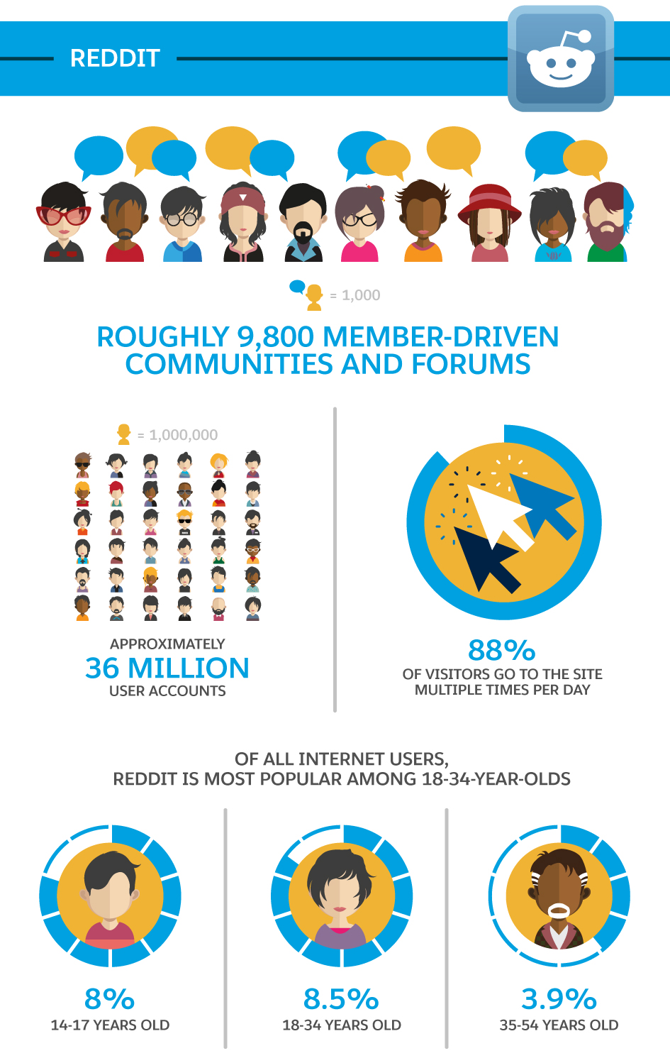 Reddit boasts approximately 36 million user accounts, 9,800 communities, and a young, active user base. (Eighty-eight per cent of users visit the site multiple times a day.) It’s also one of the most difficult platforms to penetrate due to its dispersed user base and because users are skeptical of self-promotion on the site. Subtle content marketing is the name of the game here.