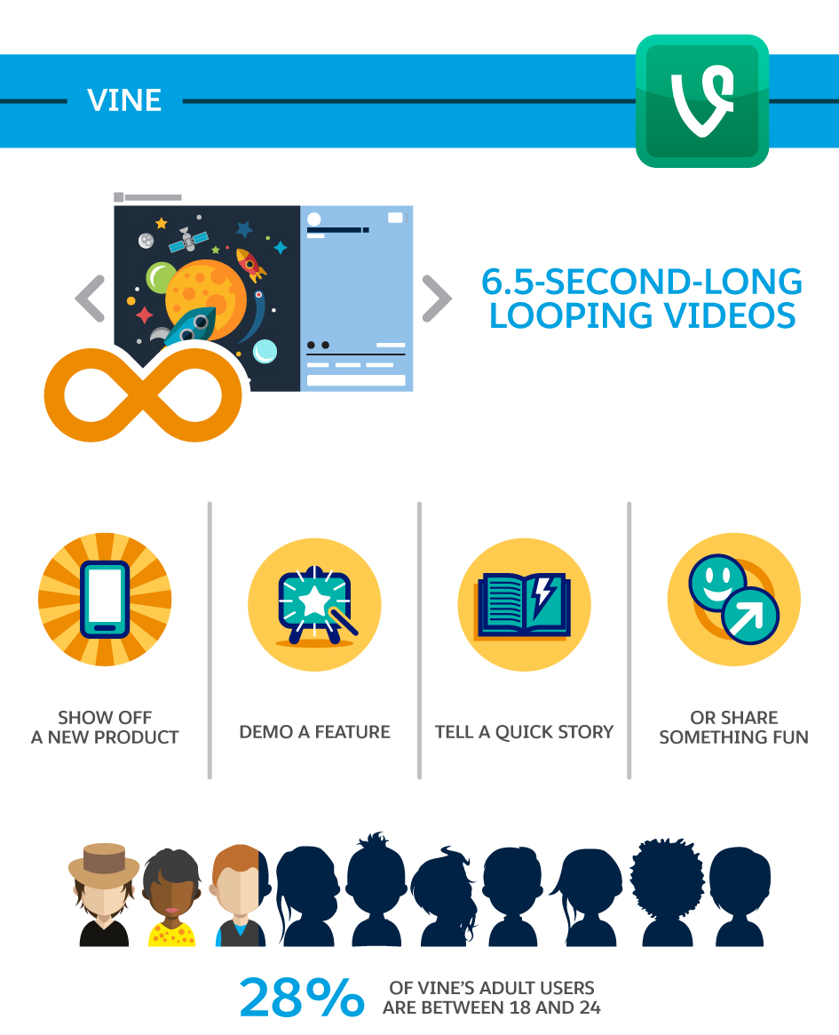 The 6.5-second looping video app had its heyday a few years ago, but it’s still a viable platform for brands and has launched a number of viral stars over the years. Vine is particularly effective for showcasing products, telling short stories, or simply sharing goofy content. With 28 per cent of adult users between the ages of 18 and 24, it’s important that Vine content be hip, engaging, and fun.