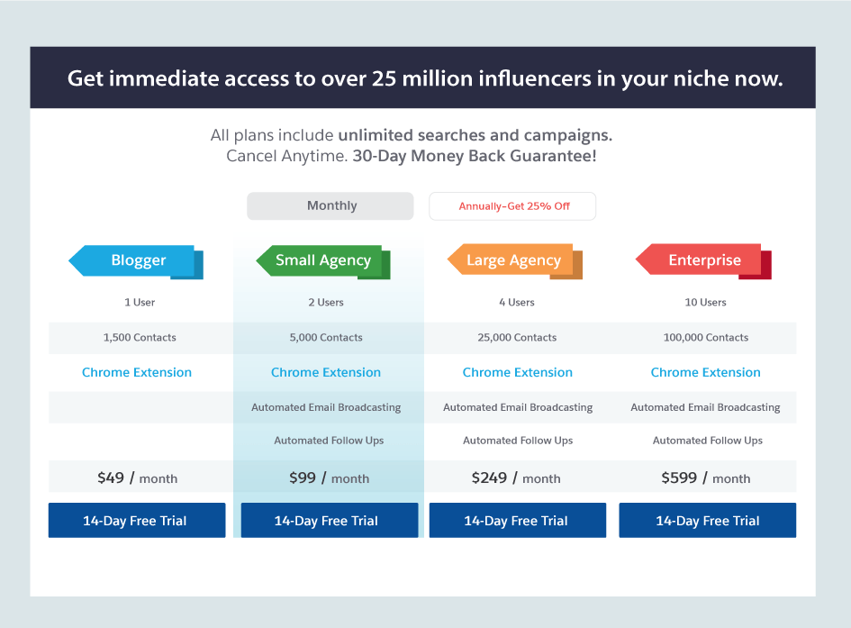 In an example from Ninja Outreach, the “Small Agency” package is highlighted and also displays how people get 25 per cent off on the annual cost by choosing that package. But there is a more budget-friendly option as well: the “Blogger” package. The features of each package are clearly displayed, showing customers exactly what they get with each option.