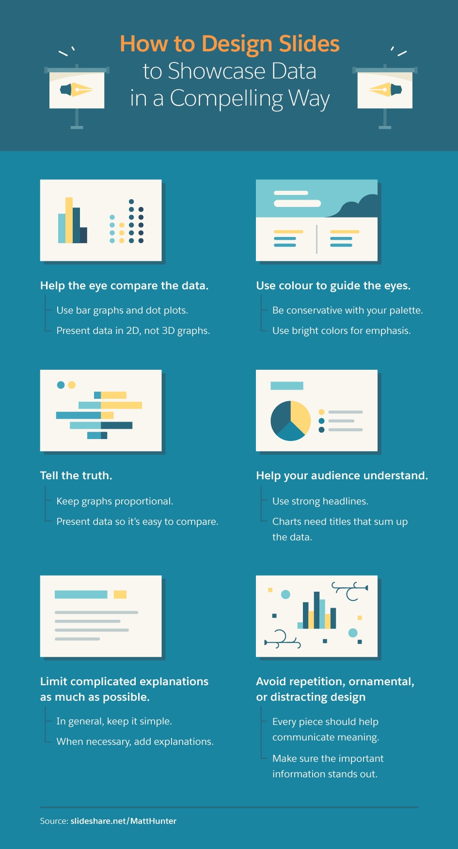 Instead of only publishing case studies and research results in long format on your website, you can use SlideShare to break up the content into compelling slides that tell a story backed by data. This format allows you to showcase your most powerful statistics on a single slide where they will stand out and grab the reader. Graphs, tables, and charts can also be used to convey a significant amount of information in the space of one slide.