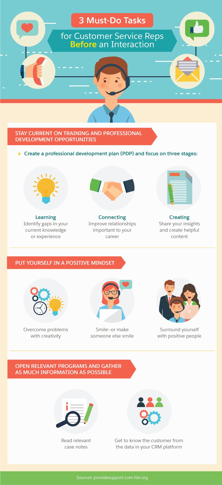 The final task that must be accomplished before any interaction is to prepare. This includes learning anything you can that will make the actual call go more smoothly. If you are expecting a scheduled call from a particular customer, replying to a message, or returning a call, take the time to access all relevant customer data via your CRM and other sources before you contact them. You can review the details of their situation and reduce delays throughout the interaction. Of course, this isn’t always possible when customers are initiating first contact, but at the very least you can ensure you are logged into any software programs you will need so that you can be ready to proceed.