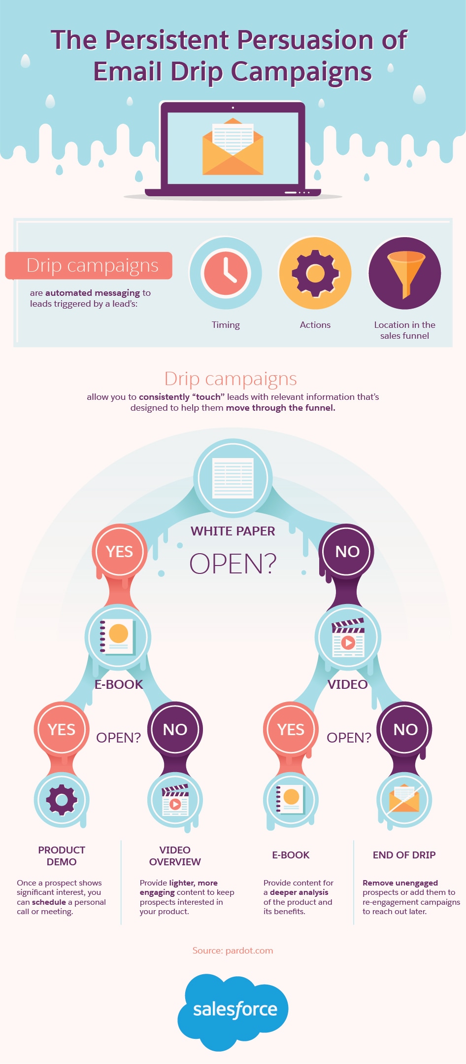 An email drip campaign—also sometimes called drip marketing, autoresponders, and automated email campaigns—is a series of pre-written emails that are scheduled to “drip” over time to a recipient. According to B2B marketing automation expert Pardot, “Drip campaigns allow you to consistently ‘touch’ leads with relevant information based on time intervals, actions taken by prospects on your website, or other parameters, freeing up valuable marketing and sales resources without neglecting your prospects.”
