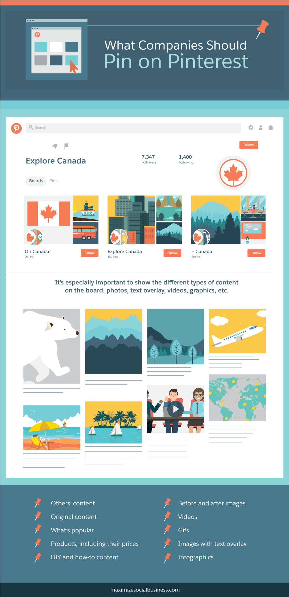 So what qualifies as purely inspirational? Quotes qualify. So does pinning other people’s pins. You can also pin images from your other content, such as blog posts, articles, and videos. In our wedding fashion example, pinning the article on ways to make your pet part of a wedding qualifies. So would video on how to create DIY wedding invitations; an infographic on what to look for when hiring a wedding planner could also draw the right audience.