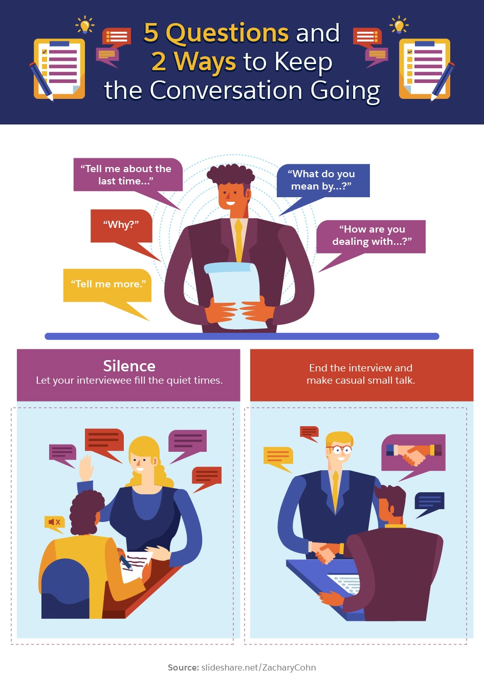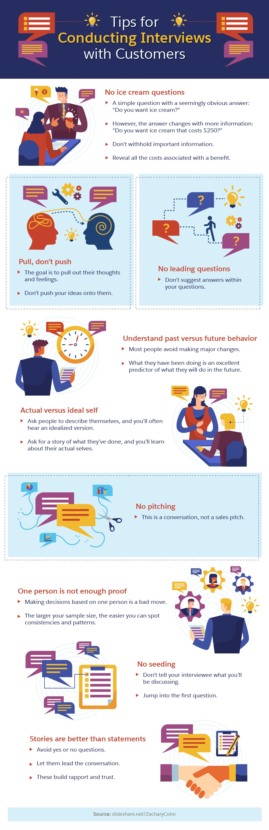 Start with open-ended questions that inspire long, story-based answers—not a simple yes or no. Ask daily-life type questions, and try not to influence the answers. If a lawyer might stand up and say, “Objection! Leading the witness!” during an interview, back off and let the customer guide the conversation a bit more. Don’t be afraid to dig deeper when an answer seems vague or off track. Spend more time listening than talking, and note any phrases and keywords they use. In addition to helping you observe patterns, these will be useful for both SEO and improving your brand’s voice.