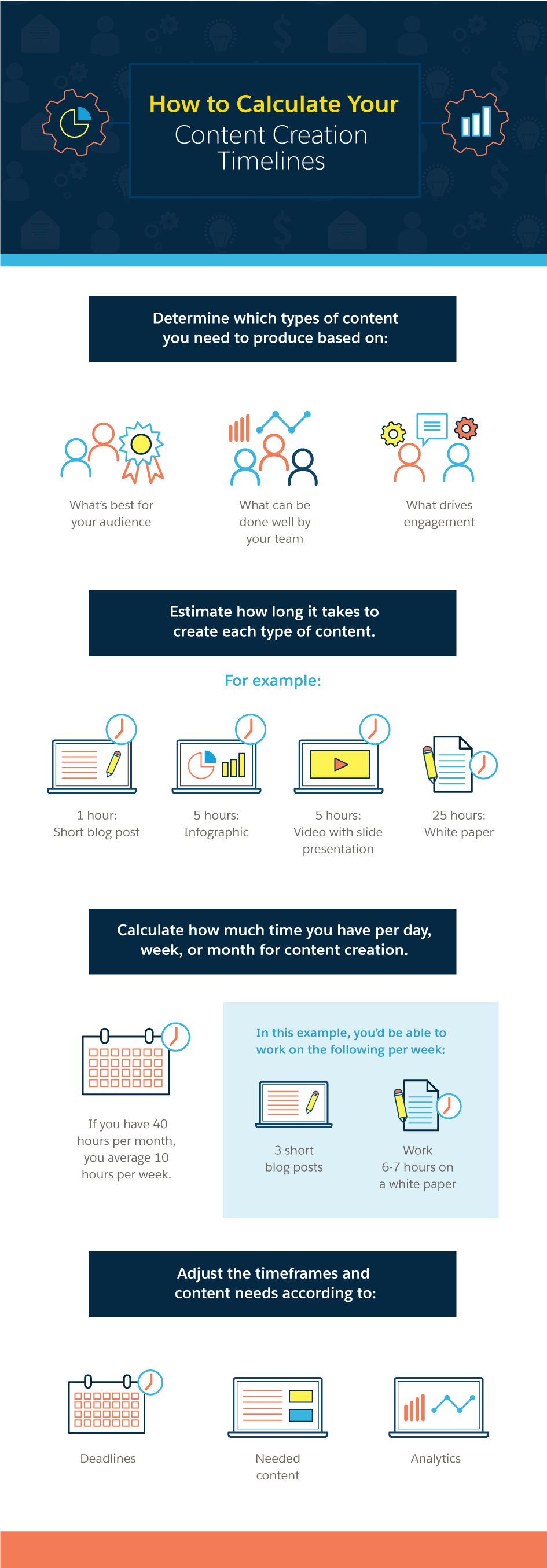 After you calculate your estimates, allocate available creation time per month. At 40 hours per month, based on the example above, a team could feasibly create 15 blog posts and one white paper.