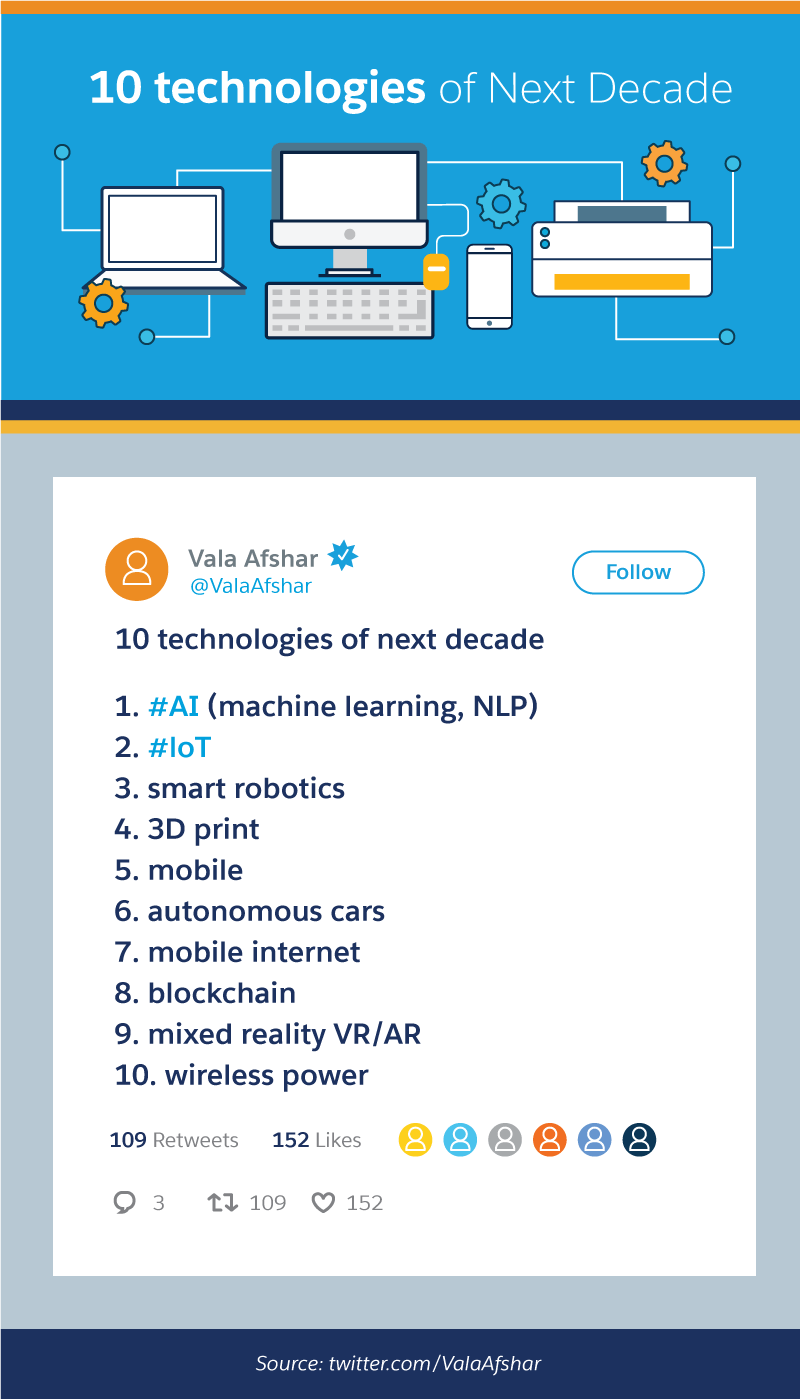This question was posed to 800 experts at the World Economic Forum in 2017. They came up with a list of seven technologies to watch over the next decade. Vala Afshar, Chief Digital Evangelist at Salesforce, added three more in his retweet of the list.