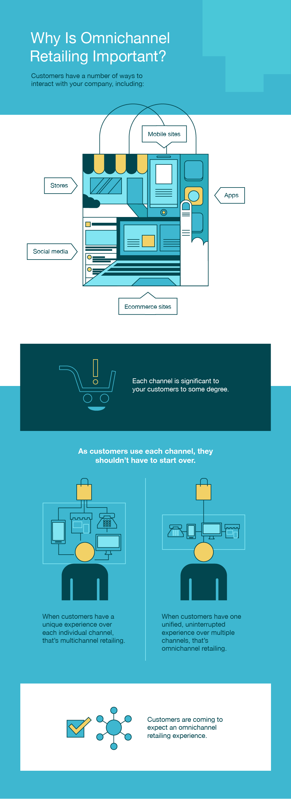 Through unified commerce, which enables omnichannel retailing, brands go beyond simply connecting their channels. They combine all user information culled from each channel into one easy-to-read dashboard. Cloud technology makes your customer's journey available for any personnel who might be helping them and any of your marketing staff who might include that user in outreach efforts.