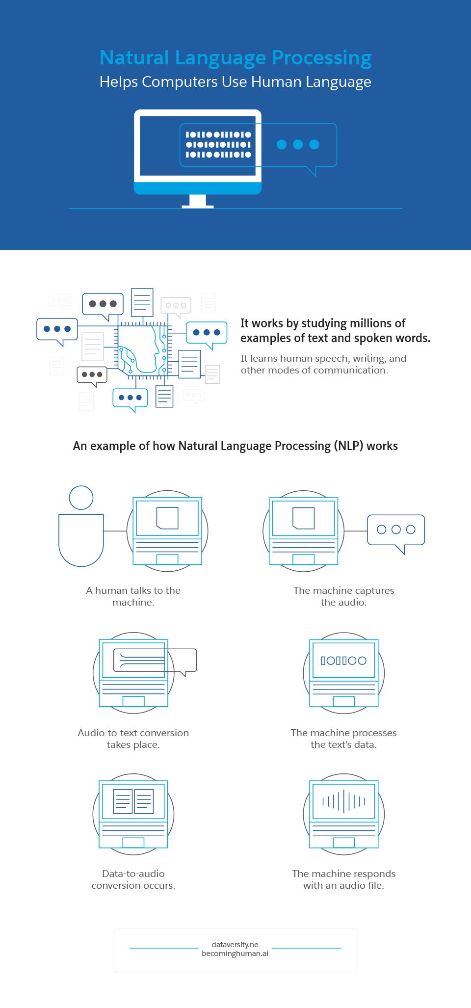 Natural language processing works by studying examples of text and spoken words created by humans. These examples number in the millions (or higher). The algorithm learns “human speech, writing, and other modes of communication.”