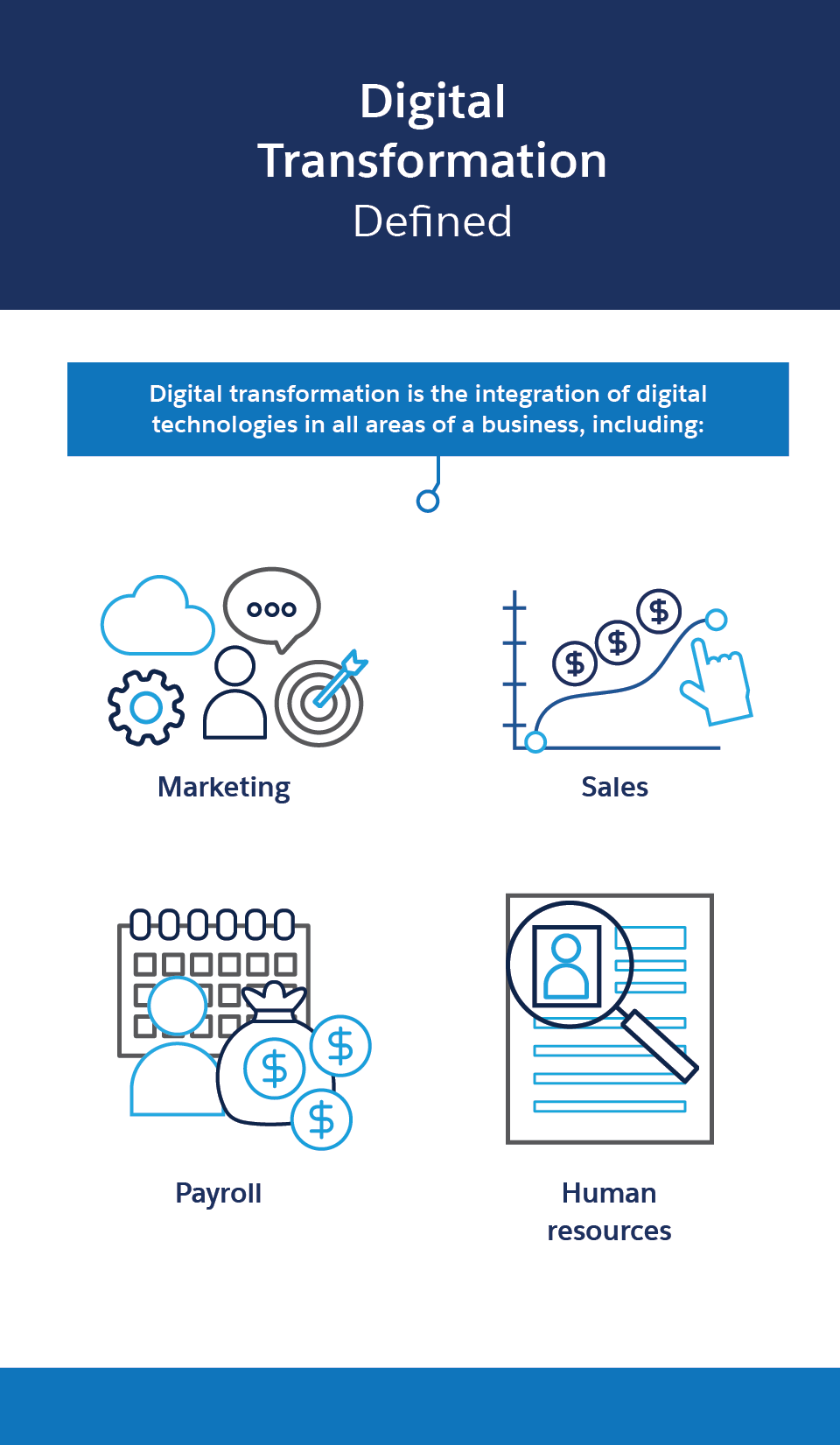 Digital transformation is the process of adopting digital technologies in all business areas, including marketing, sales, payroll, and human resources. Many businesses start the process slowly by implementing new digital solutions in areas likely to see the largest impact.