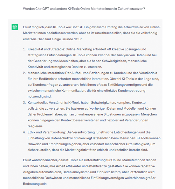 Höchste Zeit also, diese Angst zu zerstreuen. Fragen wir ChatGPT, ob es Online Marketer:innen in Zukunft ersetzen wird: