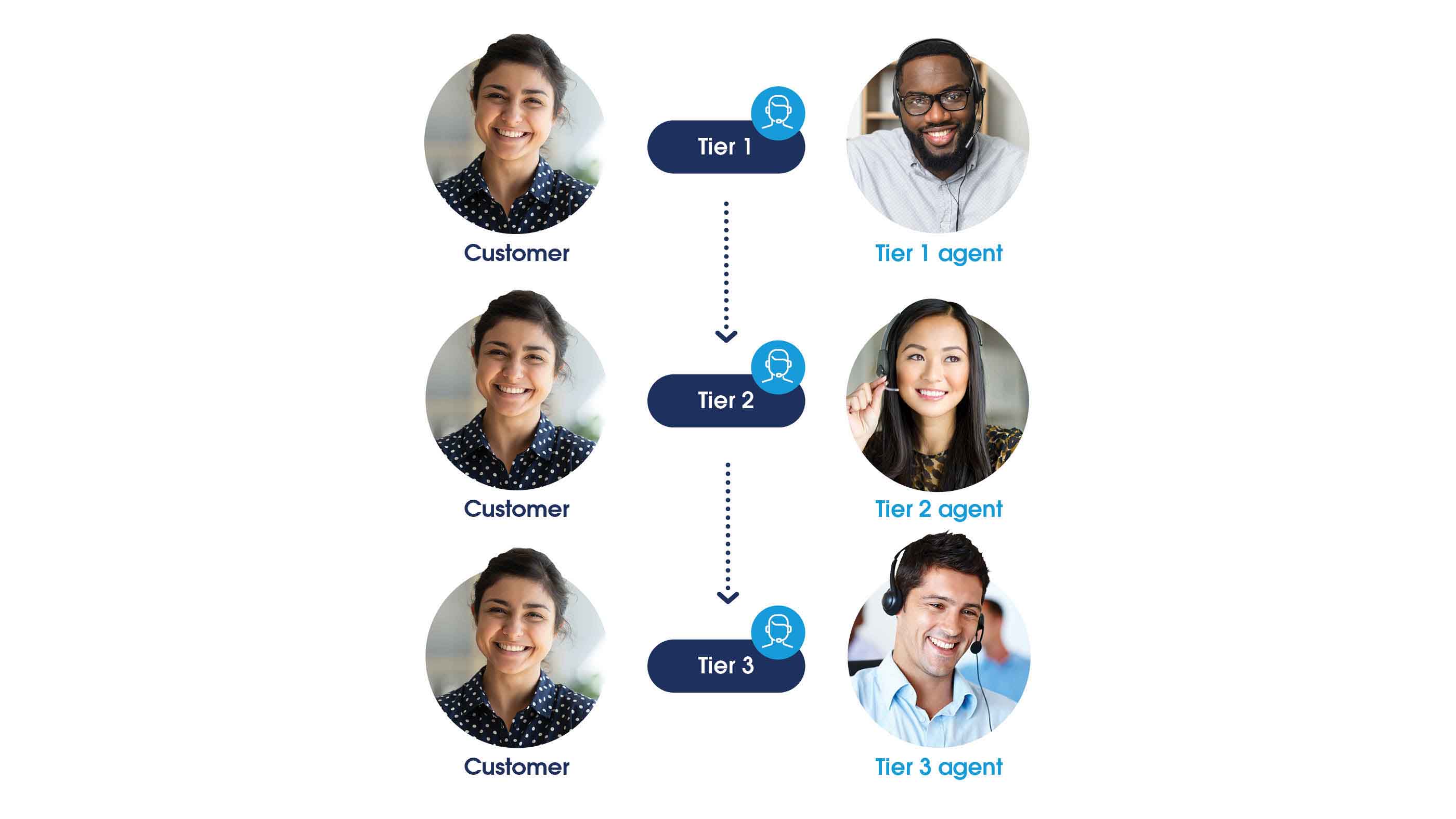 Cuando se utiliza un modelo tradicional, los equipos de atención al cliente suelen estar divididos en niveles, en función de sus conocimientos o de su experiencia con un producto determinado. Un cliente con un problema complejo suele pasar de un agente del servicio de atención al cliente de nivel 1 a un miembro del equipo de nivel 2 y, a continuación, a un agente de nivel 3.