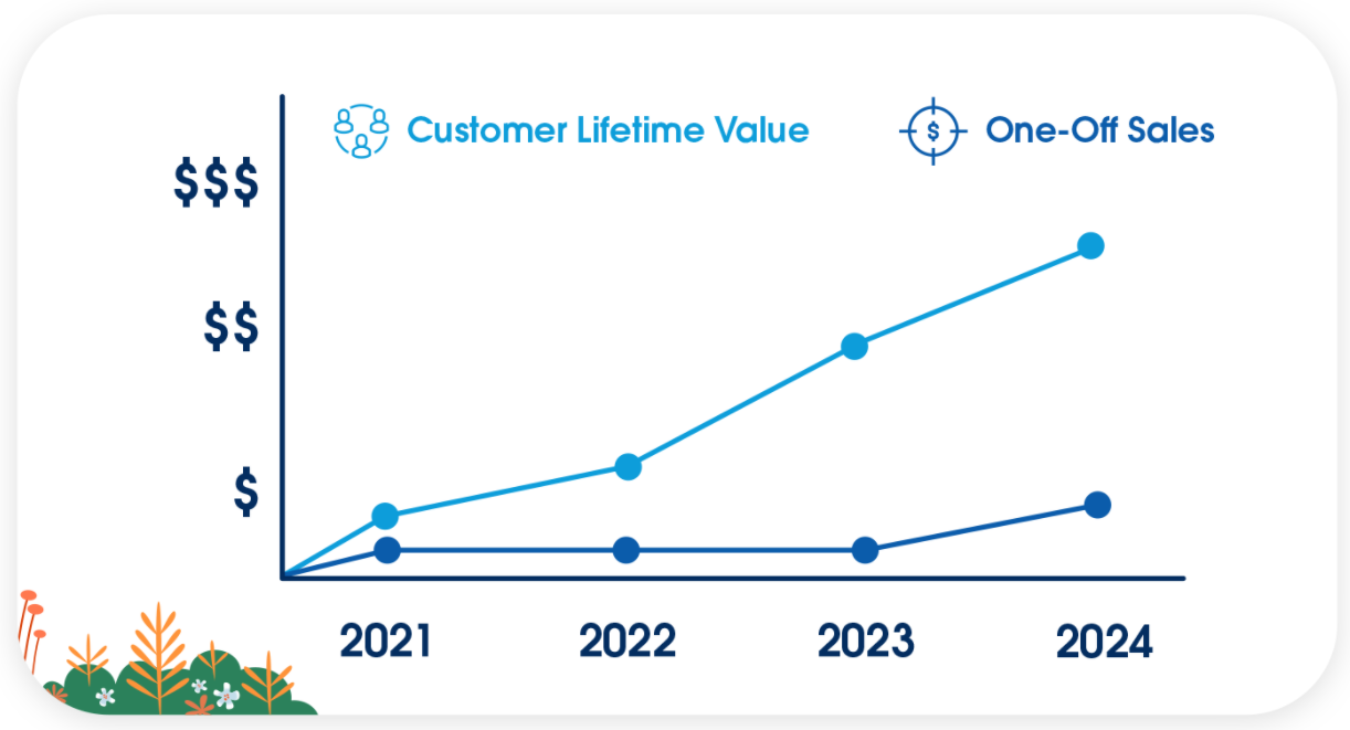 ¿Por qué importan? Para los vendedores, el atractivo de maximizar el valor de la vida útil del cliente es la resiliencia empresarial, que se ve potenciada por unos ingresos constantes. Aunque la prospección y las ventas puntuales no desaparecerán nunca, un resultado final que depende del comportamiento de compra constante de los clientes fieles supone unos ingresos predecibles y una previsión más precisa.