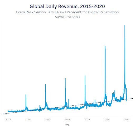 ¿Por qué? Sabemos por el análisis de los hábitos de compra de los consumidores durante casi una década que los hábitos adoptados durante los períodos pico tienden a mantenerse. La temporada alta (noviembre-diciembre) siempre establece una nueva línea de aunque el pico vuelve a bajar, nunca vuelve a los niveles previos al pico.